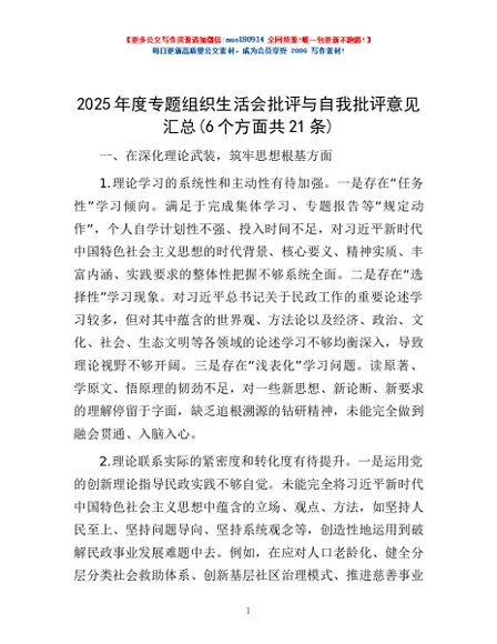 / 2025年度专题组织生活会批评与自我批评意见汇总(6个方面共21条)