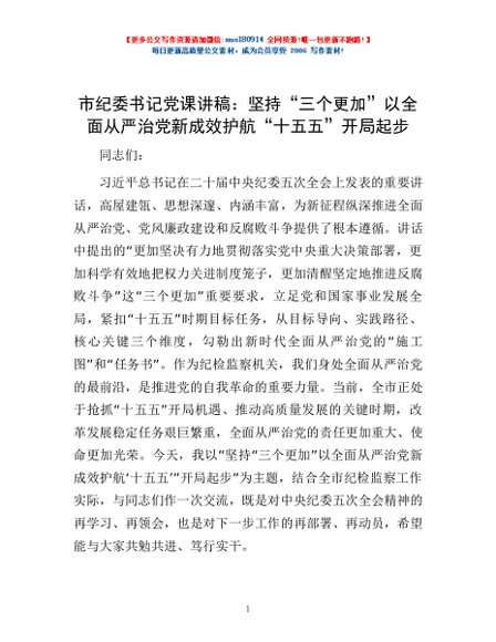 / 市纪委书记党课讲稿:坚持 “三个更加” 以全面从严治党新成效护航 “十五五” 开局起步