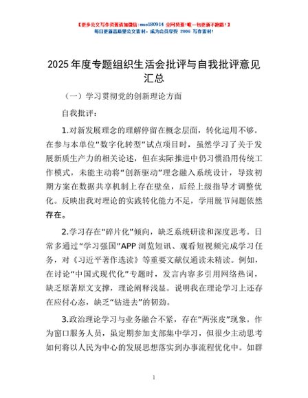 / 2025年度专题组织生活会批评与自我批评意见汇总