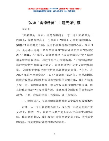 弘扬“雷锋精神”主题党课讲稿