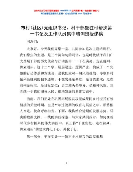 / 市村(社区)党组织书记、村干部暨驻村帮扶第一书记及工作队员集中培训班授课稿