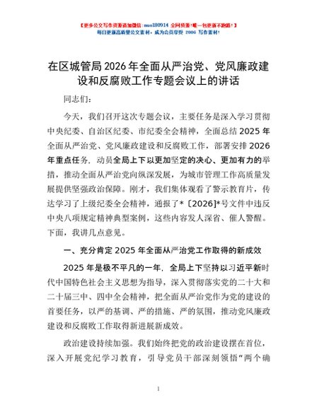 / 在区城管局2026年全面从严治党、党风廉政建设和反腐败工作专题会议上的讲话