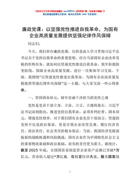 / 廉政党课:以坚强党性推进自我革命,为国有企业高质量发展提供坚强纪律作风保障