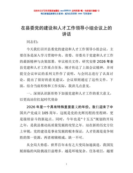/ 在县委党的建设和人才工作领导小组会议上的讲话