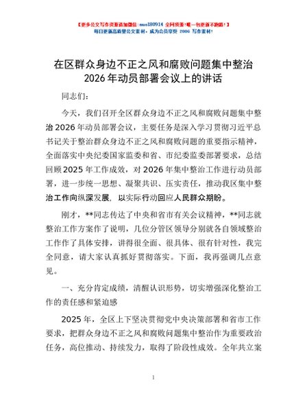 / 在区群众身边不正之风和腐败问题集中整治2026年动员部署会议上的讲话
