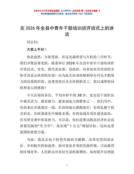 / 在2026年全县中青年干部培训班开班式上的讲话
