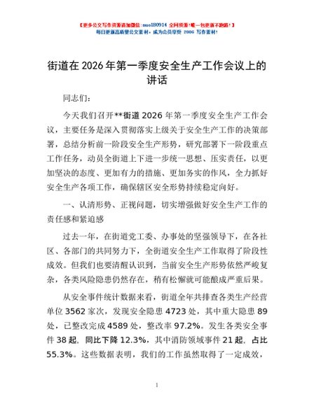 / 街道在2026年第一季度安全生产工作会议上的讲话