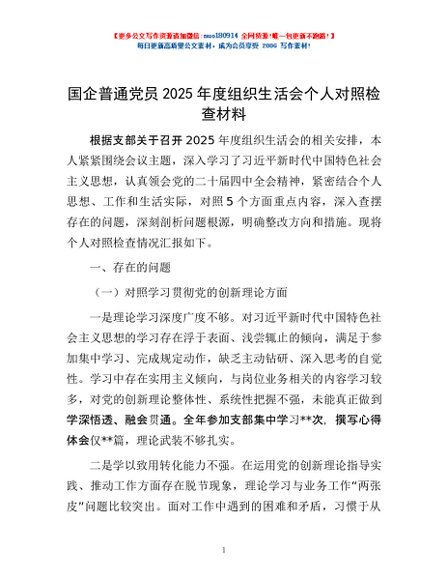 / 国企普通党员2025年度组织生活会个人对照检查材料