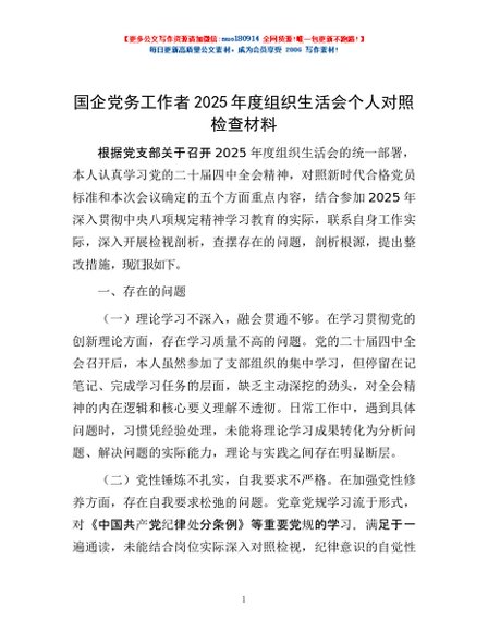 / 国企党务工作者2025年度组织生活会个人对照检查材料