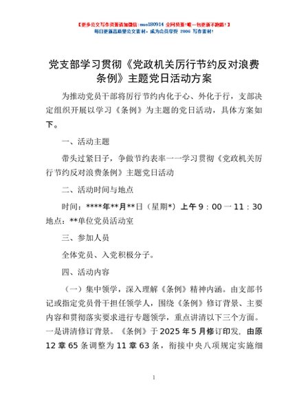 / 党支部学习贯彻《党政机关厉行节约反对浪费条例》主题党日活动方案