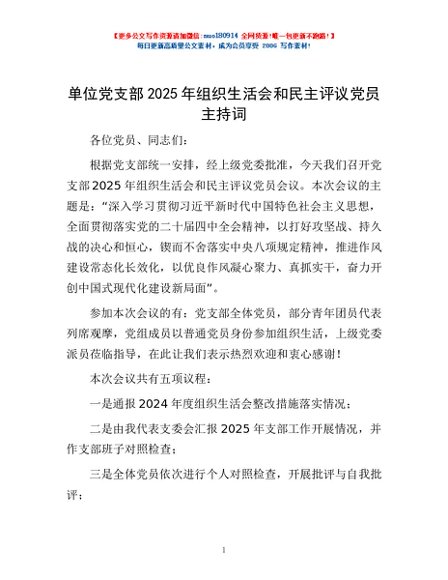 / 单位党支部2025年组织生活会和民主评议党员主持词