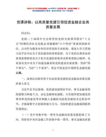 / 党课讲稿:以高质量党建引领促进金融企业高质量发展