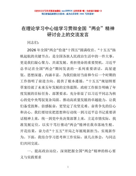 / 在理论学习中心组学习贯彻全国“两会”精神研讨会上的交流发言