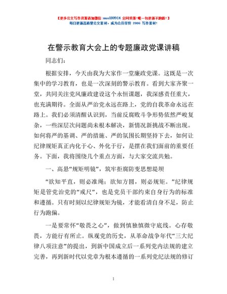 / 在警示教育大会上的专题廉政党课讲稿