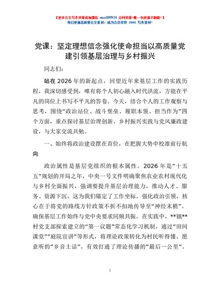/ 党课:坚定理想信念 强化使命担当 以高质量党建引领基层治理与乡村振兴