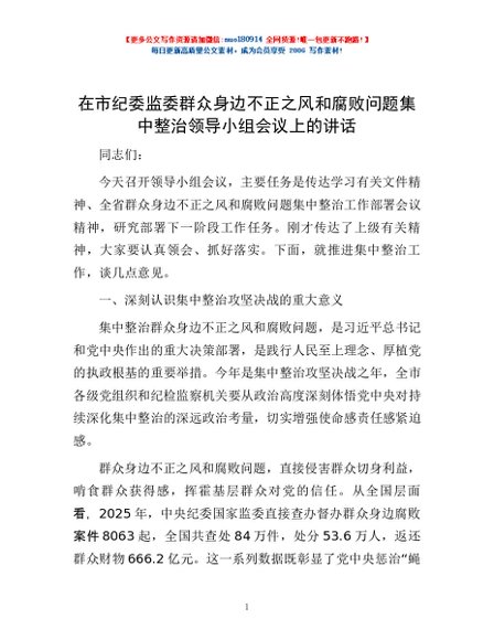 / 在市纪委监委群众身边不正之风和腐败问题集中整治领导小组会议上的讲话