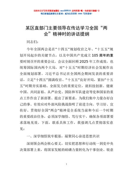 / 某区直部门主要领导在传达学习全国“两会”精神时的讲话提纲