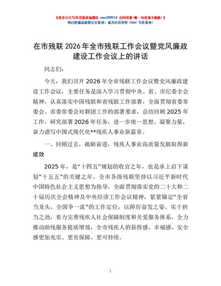 / 在市残联2026年全市残联工作会议暨党风廉政建设工作会议上的讲话