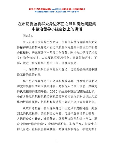 / 在市纪委监委群众身边不正之风和腐败问题集中整治领导小组会议上的讲话