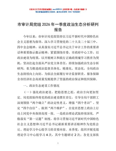 / 市审计局党组2026年一季度政治生态分析研判报告