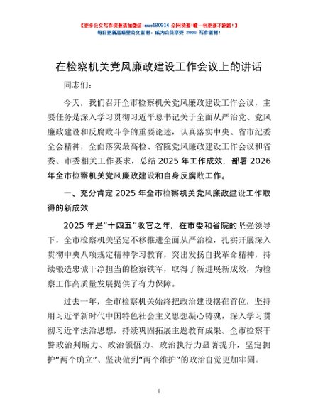 / 在检察机关党风廉政建设工作会议上的讲话