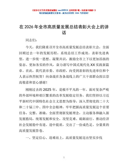 / 在2026年全市高质量发展总结表彰大会上的讲话