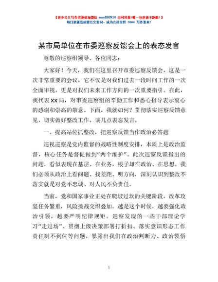 / 某市局单位在市委巡察反馈会上的表态发言