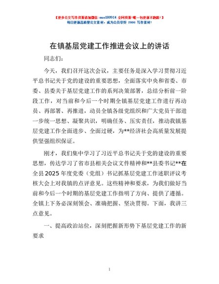 / 在镇基层党建工作推进会议上的讲话