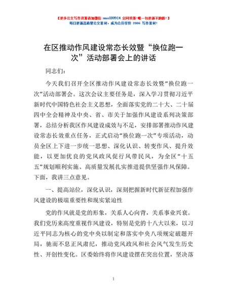 / 在区推动作风建设常态长效暨“换位跑一次”活动部署会上的讲话