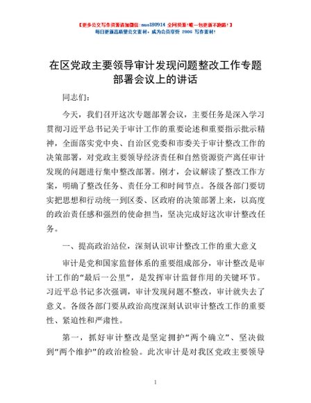 / 在区党政主要领导审计发现问题整改工作专题部署会议上的讲话