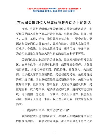 / 在公司关键岗位人员集体廉政谈话会上的讲话