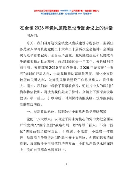 / 在全镇2026年党风廉政建设专题会议上的讲话