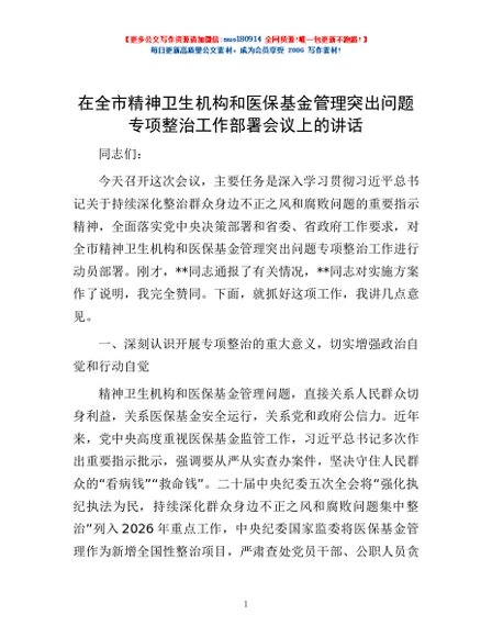 / 在全市精神卫生机构和医保基金管理突出问题专项整治工作部署会议上的讲话