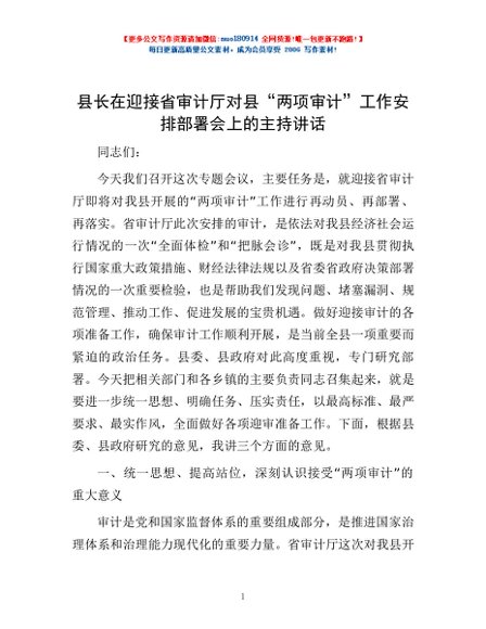 / 县长在迎接省审计厅对县“两项审计”工作安排部署会上的主持讲话