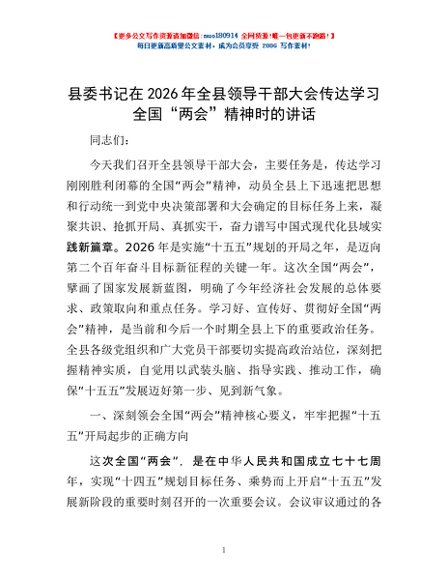 / 县委书记在2026年全县领导干部大会传达学习全国“两会”精神时的讲话