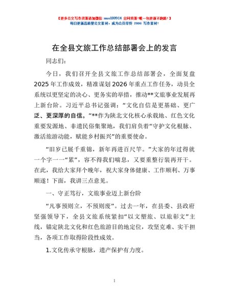 在全县文旅工作总结部署会上的发言