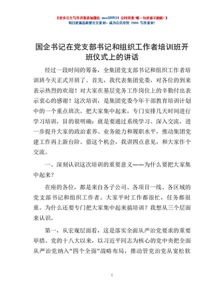 / 国企书记在党支部书记和组织工作者培训班开班仪式上的讲话