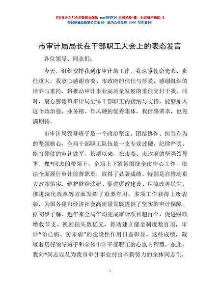 / 市审计局局长在干部职工大会上的表态发言