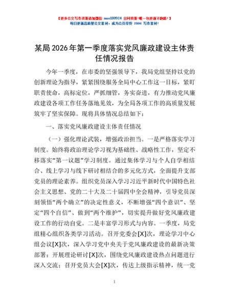 / 某局2026年第一季度落实党风廉政建设主体责任情况报告