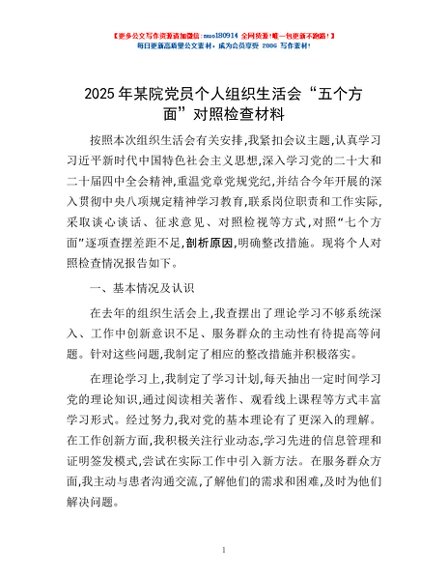 / 2025年某院党员个人组织生活会“五个方面”对照检查材料