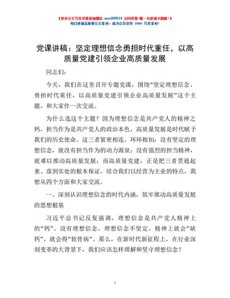 / 党课讲稿:坚定理想信念勇担时代重任,以高质量党建引领企业高质量发展
