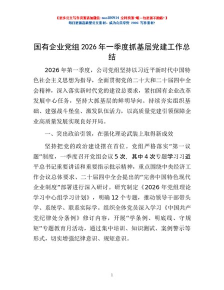 / 国有企业党组2026年一季度抓基层党建工作总结