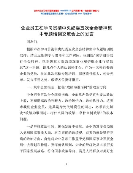 / 企业员工在学习贯彻中央纪委五次全会精神集中专题培训交流会上的发言
