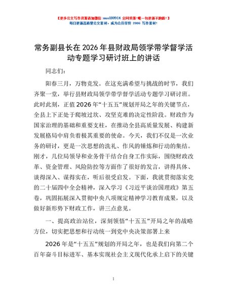 / 常务副县长在2026年县财政局领学带学督学活动专题学习研讨班上的讲话