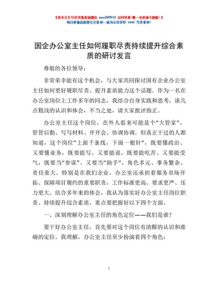 / 国企办公室主任如何履职尽责持续提升综合素质的研讨发言