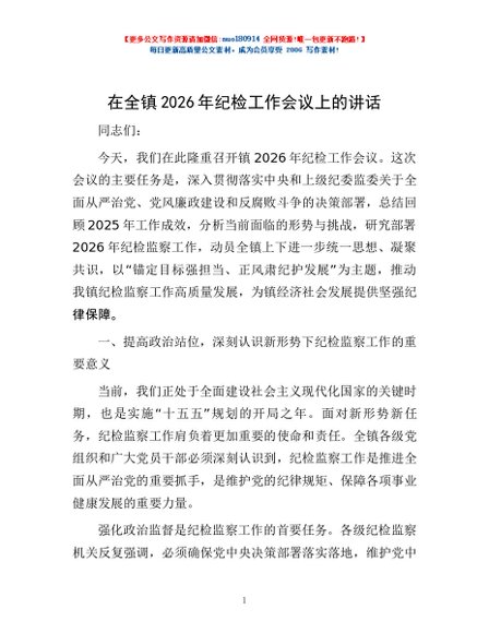 / 在全镇2026年纪检工作会议上的讲话