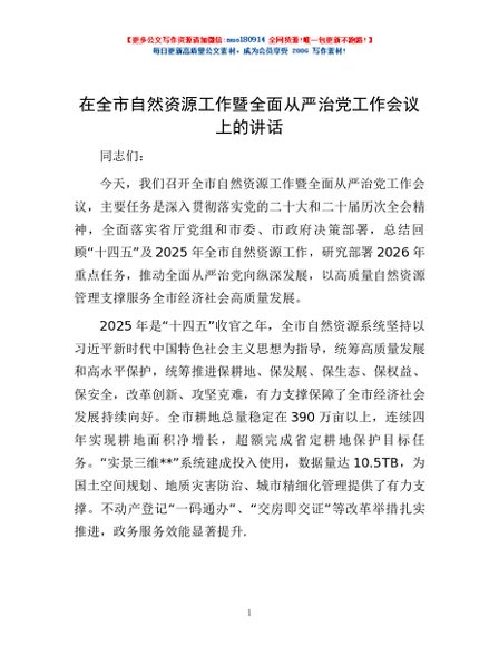 / 在全市自然资源工作暨全面从严治党工作会议上的讲话