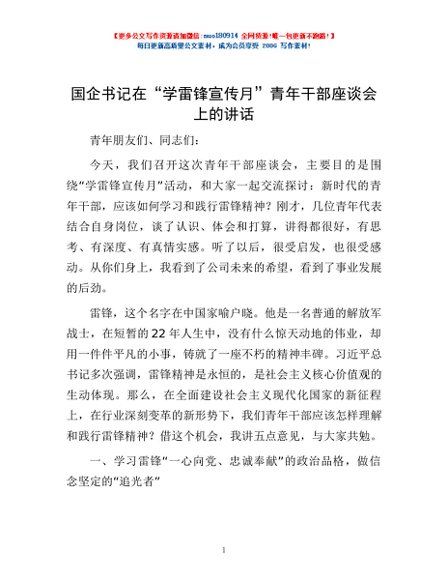 / 国企书记在“学雷锋宣传月”青年干部座谈会上的讲话