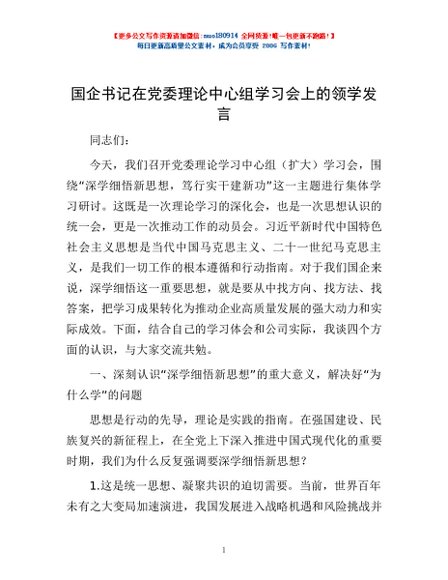 / 国企书记在党委理论中心组学习会上的领学发言