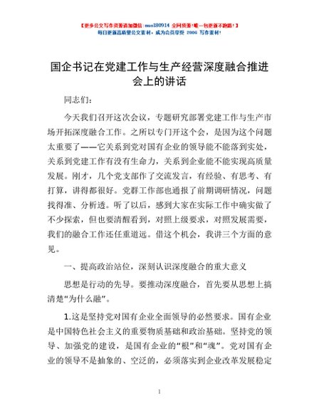 / 国企书记在党建工作与生产经营深度融合推进会上的讲话